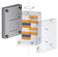 With core-back injection moulding, different materials are injected one by one. Once the first material has been injected into the cavity, the cavities will be swapped. Flexible sealing elements will now open the filled cavity towards the empty cavity to fill the remaining component with the second material through a second sprue. Both materials may be the same, or different